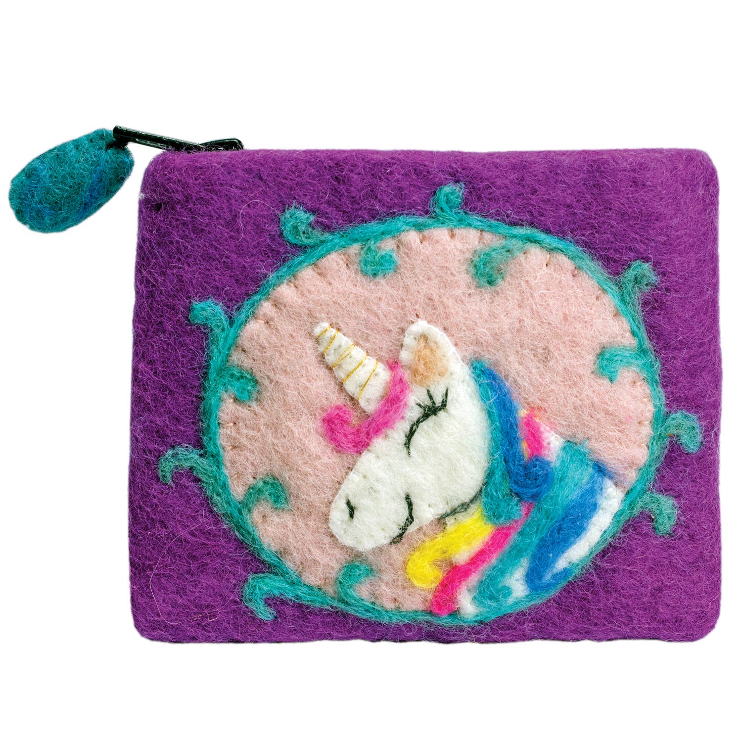 This magically majestic multi-colored marvel is a crescendo of kaleidoscopic craft. Catch your own! Handfelted with 100% natural wool by a Fair Trade production group in Nepal. Made with a high quality YKK lead free zipper. Convenient size and lined with black cotton. Features a charming felt zipper pull and delightful handcrafted details. An original Wild Woolies design by dZi Handmade, member Fair Trade Federation. 5"w x 4"h